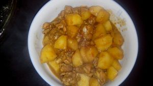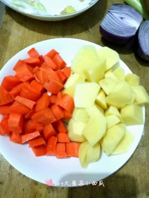 然后再加入土豆、洋葱、圆椒、盐、焖炒3分钟收汁下味精包尾油即可。(如果汤计稀,可勾薄芡)