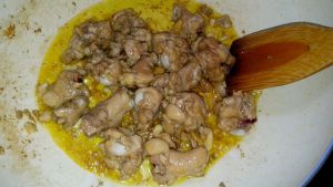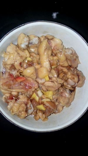 葱、姜、花生油爆香下入鸡块煸炒,放生抽、咖喱再加入清水(高汤)焖10分钟。
