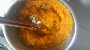 用筷子搅拌成南瓜泥。随后放入糖,量自己控制,喜欢吃甜的就多放点。南瓜本身富含果糖,不必加太多糖都有很自然的甜甜的感觉。