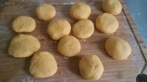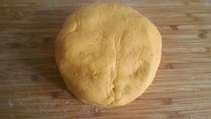 再将糯米粉和玉米淀粉与蒸好的南瓜揉成光滑的面团