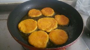 把南瓜饼搓成圆饼放进锅里,小火慢煎