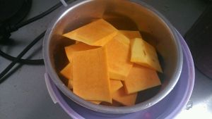 南瓜切片放锅里蒸(我用的是单人电锅),20分钟不到,蒸好搅拌成南瓜泥。