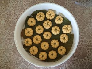 蒸架上放上抹上油的箬叶,再将南瓜饼放上,要留一定的空隙