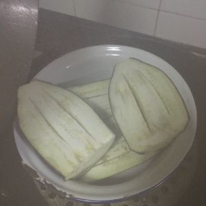 将茄子对半切开,划刀口以便入味。