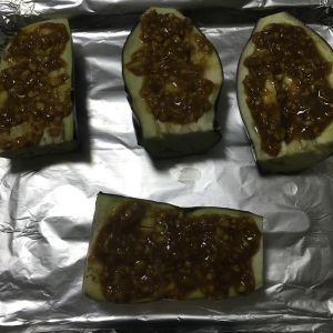 用勺子把调好的酱均匀的敷在茄子上面,酱厚厚的铺一层就好。然后放入烤箱中,上下管都是200度,烤10分钟,主要让蒜泥酱和茄子完全熟,且两者融合在一起,味道超赞。