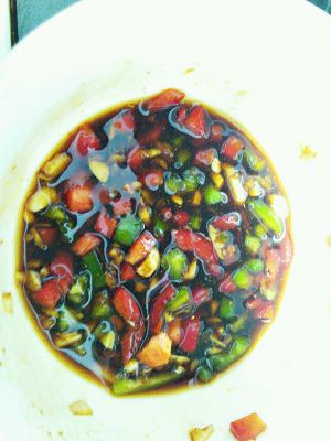 将葱花,辣椒末,蒜末加耗油,蒸鱼豉油适量水浸泡五分钟备用。