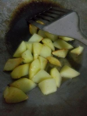 油烧热,小火下土豆炸至金黄色,捞出备用