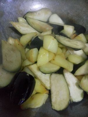 把茄子和土豆分开放入油锅中炸,先放土豆,土豆炸成金黄色并且形成一层外皮后捞出。捞出土豆后放入茄子,因为有时茄子太老会有种子,炸完茄子再炸土豆,油锅里的茄子子就糊了,而且土豆比茄子吸油少,油不会浪费太多。茄子炸到表面金黄捞出。在炸制的这一步,如果实在不知道如何判断火候,那就用筷子戳一下油锅里表较大块的,能戳进去就是可以了。