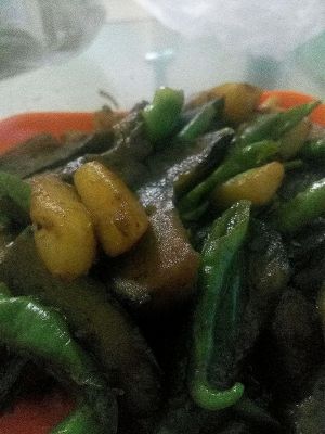 倒入茄子炒,放入辣椒翻炒放入土豆翻炒均匀加入盐