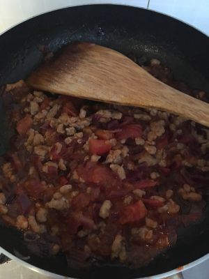 蕃茄炒得差不多就可以放肉末进去翻炒,要把肉末弄散,这样口感会比较好