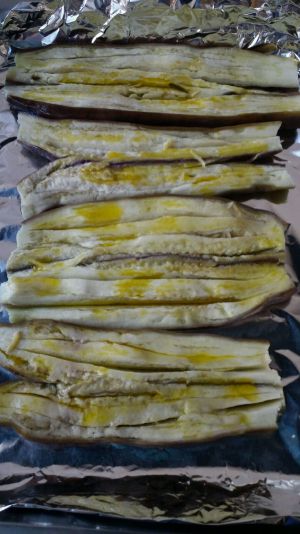 茄子洗净切两半,再对开切,如图,用刀在茄子里面划几刀。烤盘裹锡纸,放入茄子,然后将烤盘放入烤箱,上下火中层160度烤5分钟取出。