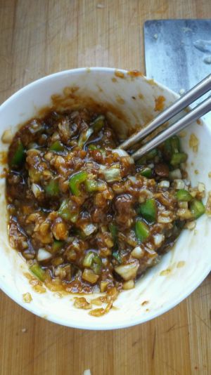 在蒸茄子时做调料 辣椒切碎和大蒜末放入锅碗中,加烧烤酱 酱油 蚝油 大酱适量 味素