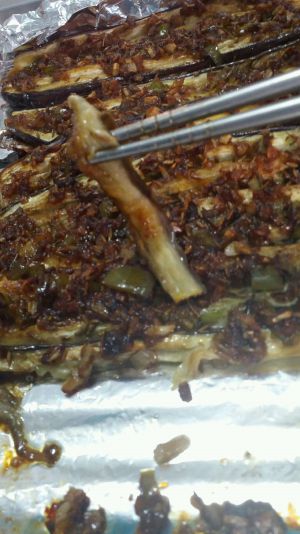 1.烤盘上铺好锡纸,放上蒸好的茄子;2.均匀刷一层酱料;3.撒上大蒜;4.放烤箱,上下火180度10分钟