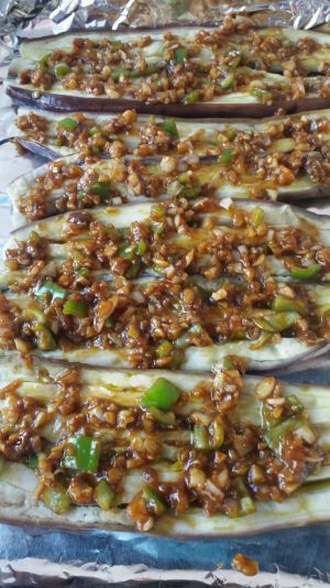 取出茄子将上面的酱汁均匀涂抹在茄子上,放入烤箱,160度上下火中层烤制10分钟。
