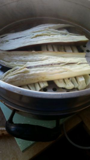茄子切成两半 但不要切断 用刀在茄子上划几个刀口 如图 放锅上蒸 10分钟 待茄子软化了备用