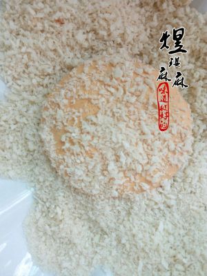 用手慢慢按成圆饼,两面用湿布蘸一下,然后放面包糠里滚滚。
