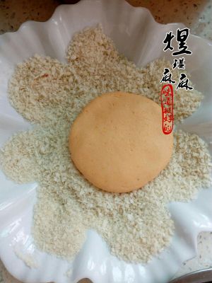 再把小面团揉软摊平,厚度适量,双面粘上备好的熟芝麻。