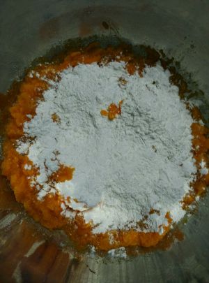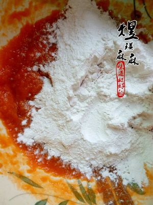 加入适量面粉,适量盐,少量糖搅拌均匀。直到加入的面粉和南瓜糊变成粘稠状即可