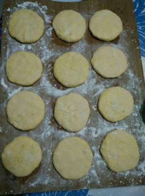 把面团分成若干份,揉成小圆球后压成饼状,放在撒了糯米粉的案板上。
