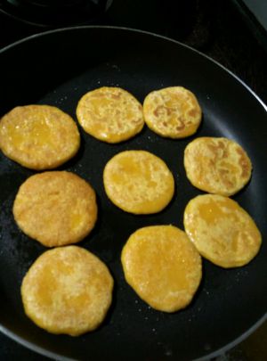 平底锅放油烧热,把南瓜饼排开放好,小火煎至两面金黄就可以了。