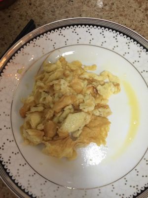 7.热锅下油,把鸡蛋炒熟,一熟就盛出,不要炒老了。