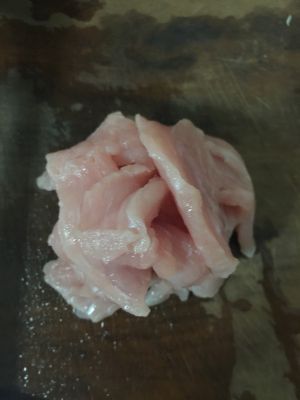 猪肉切片,加料酒、淀粉、胡椒粉、盐腌十分钟。