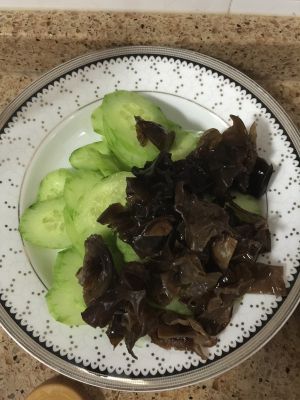 装盘上桌,黄瓜脆木耳滑鸡蛋嫩黄花韧,肉丝儿倍儿香,米饭绝配!