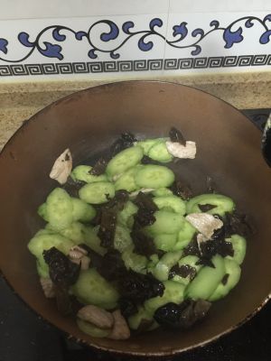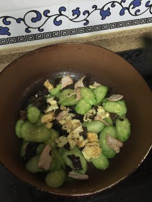 加入黄瓜与黑木耳一起炒,加料酒,不停翻炒至黄瓜片成透明状