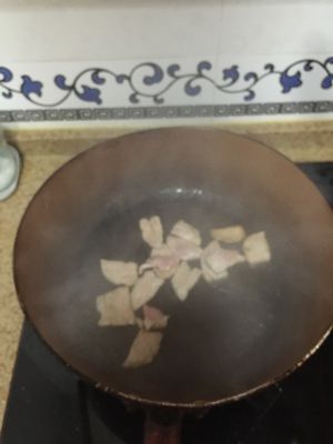 锅中加少许油,滑炒肉片至熟,加葱蒜炒香。