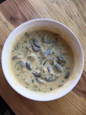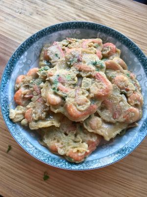 不爱吃姜,所以把虾中的姜取出。虾倒入面粉糊,搅拌均匀。