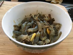 虾去头,洗净沥干。加入适量料酒、生抽、胡椒粉、生姜、大蒜腌制半小时左右。姜是为了去腥,不喜欢吃的话煎的时候可以取出。