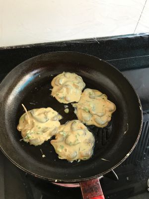 VELOSAN鹅卵石炒锅倒入少许植物油,舀入一勺摊成小饼状;