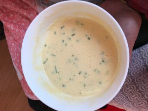 一个鸡蛋、适量面粉、葱花、盐,加入适量水,一个方向搅拌,抬起筷子会挂上面粉糊就可以了。