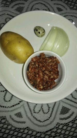 把适量的熟土豆用刀背压成泥,洋葱切丁,鹌鹑蛋去壳加入肉末中,再加入适量的淀粉,酱油,胡椒粉,料酒,盐把肉末等拌匀待用。