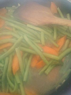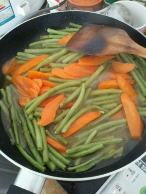 然后添加水,蚝油,蒜,翻炒,接着根据爱好加点胡萝卜,盖上焖煮2至3 分钟左右
