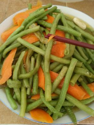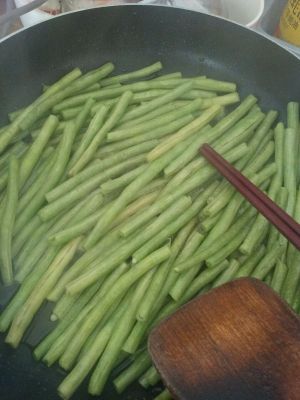 先把葱姜花椒用油爆香放入五花肉,翻炒片刻放入豆角,因为豆角是用水焯过的所以不用炒太久,最后把放有蒜沫和淀粉调好的酱汁倒入锅内收汁即可!