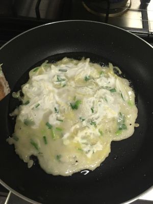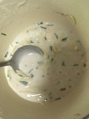 土豆切丝(尽量细),葱切成葱花,放入高筋面粉和糯米粉中,加入矿泉水用筷子混合。同时加入盐和胡椒粉。搅拌均匀成图中的粉浆状态即可,粉浆要尽量稀,容易摊熟。