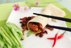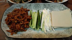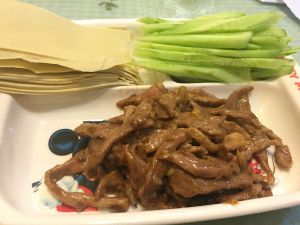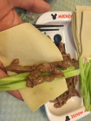 拿一张豆皮放入青瓜和肉丝卷好就可以开吃啦!