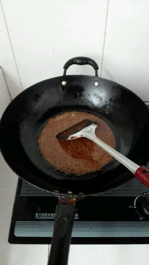 另起一油锅,放少许甜面酱,葱姜水,鸡精,糖,料酒,炒至起泡