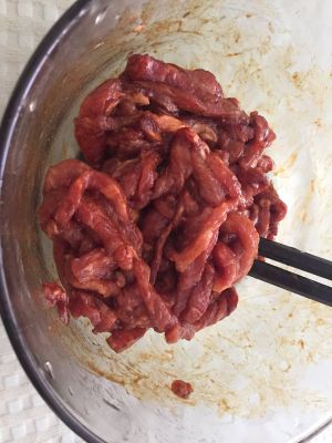 里脊肉切丝,放入盐、生粉、老抽、料酒腌制5分钟