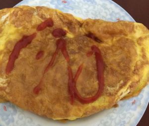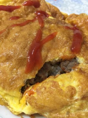 蛋皮半熟时,把炒饭放进去,再小火煎一会,出锅,把饭顺势倒到盘子底部,蛋皮在上,加点番茄酱,开吃!