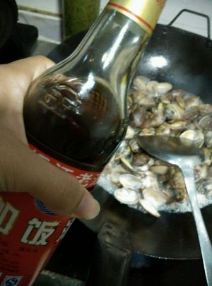 再加入己清洗好的花蛤,翻炒几下再放入酱油,再加一点水。