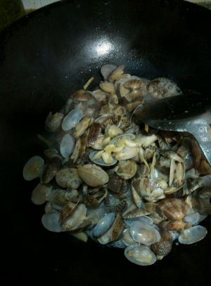炒个两三分钟,花蛤口张开了,下入适量加饭酒,盐,味精
