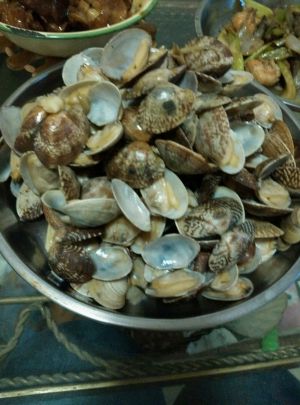 买吐沙差不多的活花蛤,用不锈钢盆使劲掂几遍,将剩余泥沙掂出来,死花蛤会掂碎,用水洗干净。