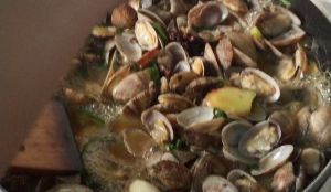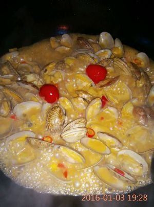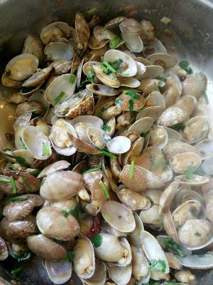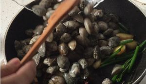翻炒一会后,等待花蛤开口(会开口的花蛤,都是新鲜的哦。紧闭大门的,都是死翘翘的)。