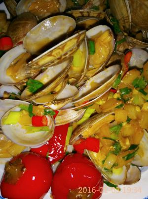 锅中放油烧热,放入葱、姜蒜、沙茶(加了比较香,不加汤甜)炒香。淀粉。然后下花蛤翻炒