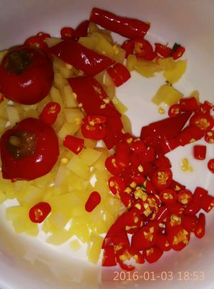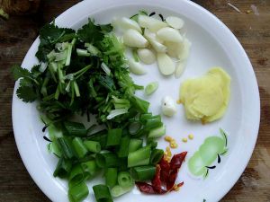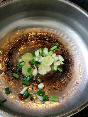 油7成熟时,分别放入姜、蒜、葱、辣椒,炒扁,爆香