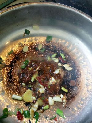 锅内入油烧热。依次放入小葱、姜片、火锅底料、大蒜、花椒大料。