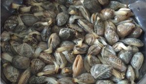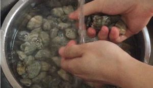 新鲜的花蛤在调好的海水中浸泡半天时间,让其吐沙。(花蛤是前滩贝壳,会有一部分砂石存在。在海水中养半天,可以去掉砂石。)