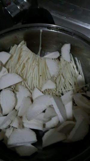 先把土豆、莲藕切片,金针菇去根洗干净,洋葱切丝备用。